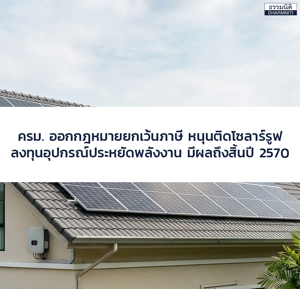 ราชกิจจานุเบกษาเผยแพร่ พระราชกฤษฎีกาออกตามความในประมวลรัษฎากร ว่าด้วยการยกเว้นรัษฎากร (ฉบับที่ 805) พ.ศ. 2569 ลงวันที่ 2 มีนาคม 2569 โดยมีผลบังคับใช้ตั้งแต่วันถัดจากวันประกาศเป็นต้นไป เพื่อส่งเสริมการใช้พลังงานแสงอาทิตย์ในภาคครัวเรือน และสนับสนุนการลงทุนด้านการอนุรักษ์พลังงานของภาคธุรกิจและประชาชน