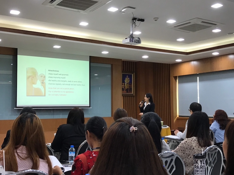 โดยช่วงเช้ามีการอบรมบุคลิกภาพในหัวข้อ “การพัฒนาบุคลิกภาพสู่ความสำเร็จ” โดยวิทยากร ดร.นทษร สุขสารอมรกุล (คุณหนูนา) ได้มาให้ความรู้เรื่องการพัฒนาบุคลิกภาพทั้งภายนอกและภายใน ตลอดจนการแสดงออกอย่างไรให้เกิดความประทับใจแก่ผู้พบเห็นเพื่อพัฒนาตนเองไปสู่บุคลิกภาพที่ดี